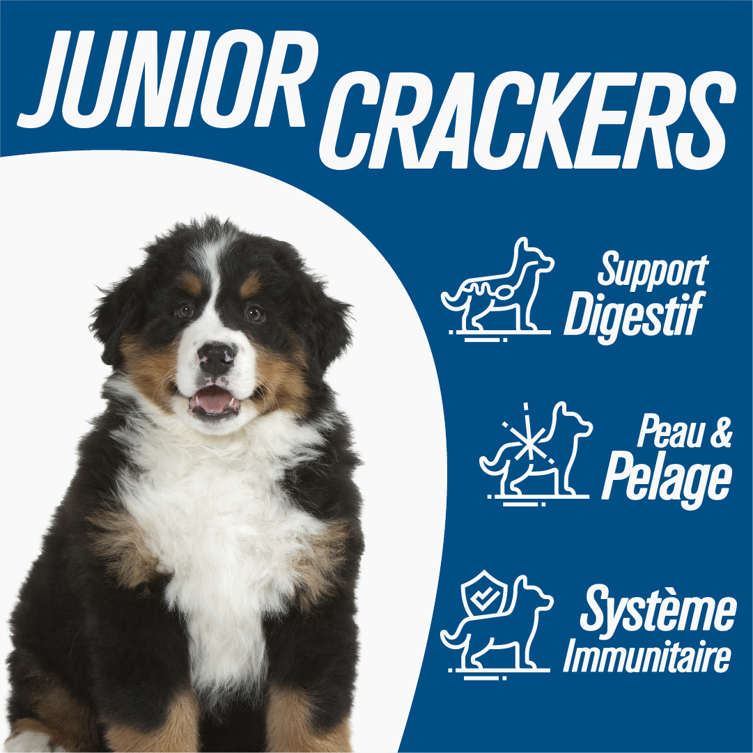 Iso-dog JUNIOR Crackers Large Breeds est un aliment complet équilibré pour chiots et jeunes chiens de races de grande taille (poids de l’adulte: > 25 kg), jusqu’au 12e-18e mois.