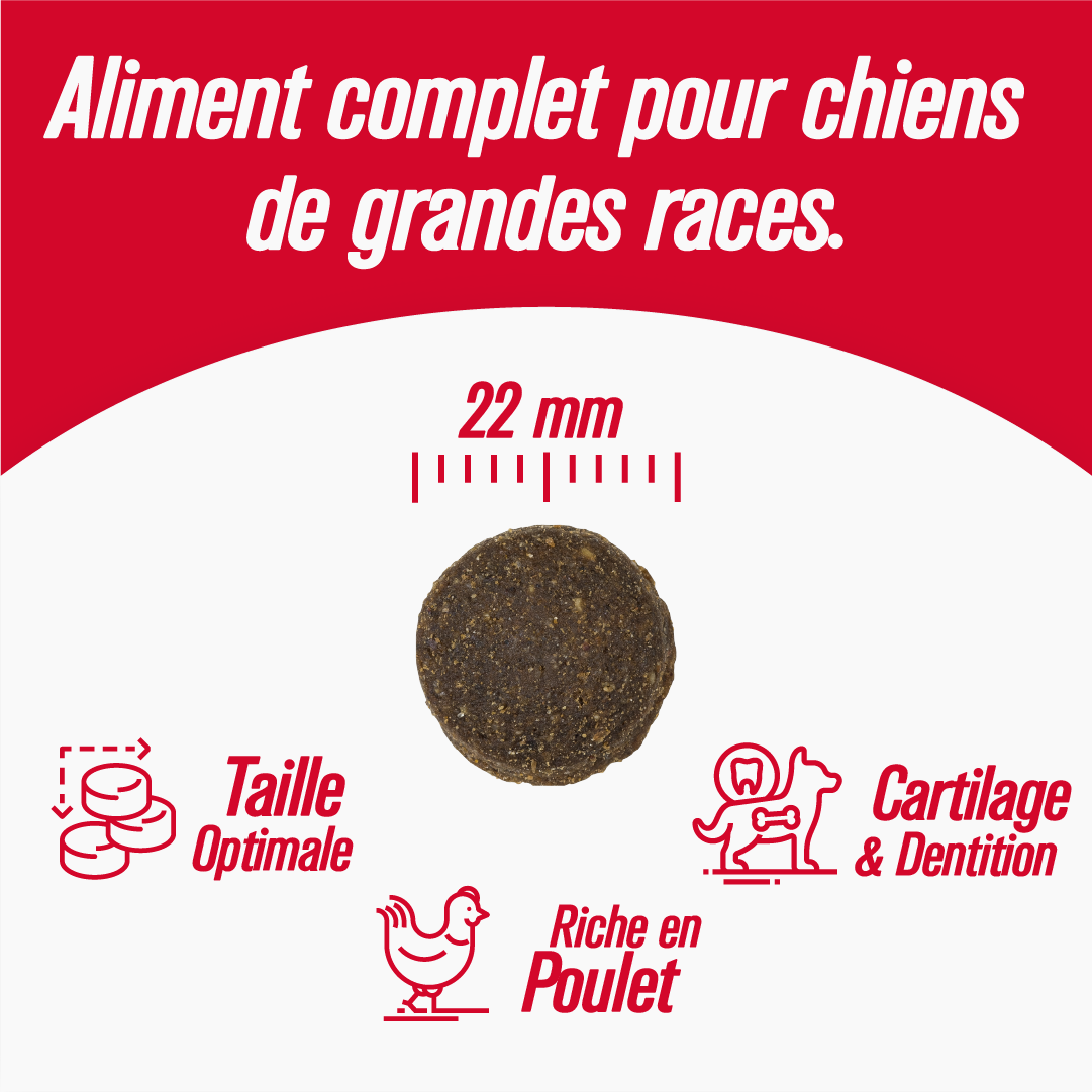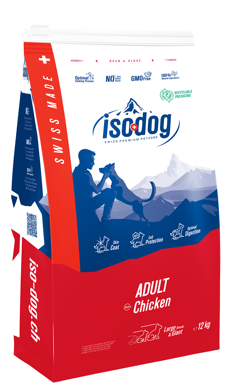 Iso-dog ADULT Chicken Large Breeds est un aliment complet pour chiens de grandes races, à partir du 12e mois et jusqu‘à l’âge d’environ 6 ans. Sa composition spécifique, ses nutriments très digestes ainsi que la forme des croquettes conviennent parfaitement aux chiens à partir de 25 kg.