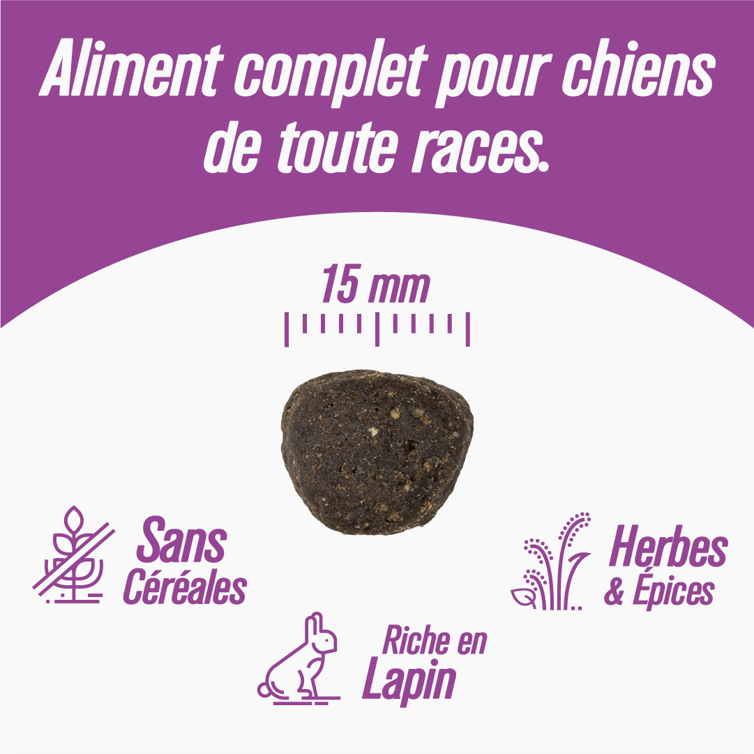 Viande de poulet déshydratée, petits pois, viande de lapin déshydratée (15%), pomme de terre séchée (14%), graisse de volaille, pulpe de betterave, levure de bière, graines de lin, marc de pomme, chlorure de sodium, mélange d’épices (0.5% : curcuma 1,3 g/kg , genévrier 1,2 g/kg, coriandre 900 mg/kg, cerfeuil 500 mg/kg, thé vert 500 mg/kg), fructo-oligosaccharides (0,5%), mannan-oligosaccharides (0,2%).