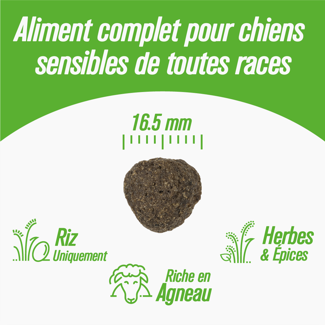 Viande d’agneau déshydratée (20%), riz brun (18%), riz blanc (18%), protéines de pomme de terre, graisse de volaille, pulpe de betterave, graines de lin, levure de bière (1.5%), huile de saumon (1%), chlorure de sodium, fructo-oligosaccharides (0,5%), mannan-oligosaccharides (0,2%).