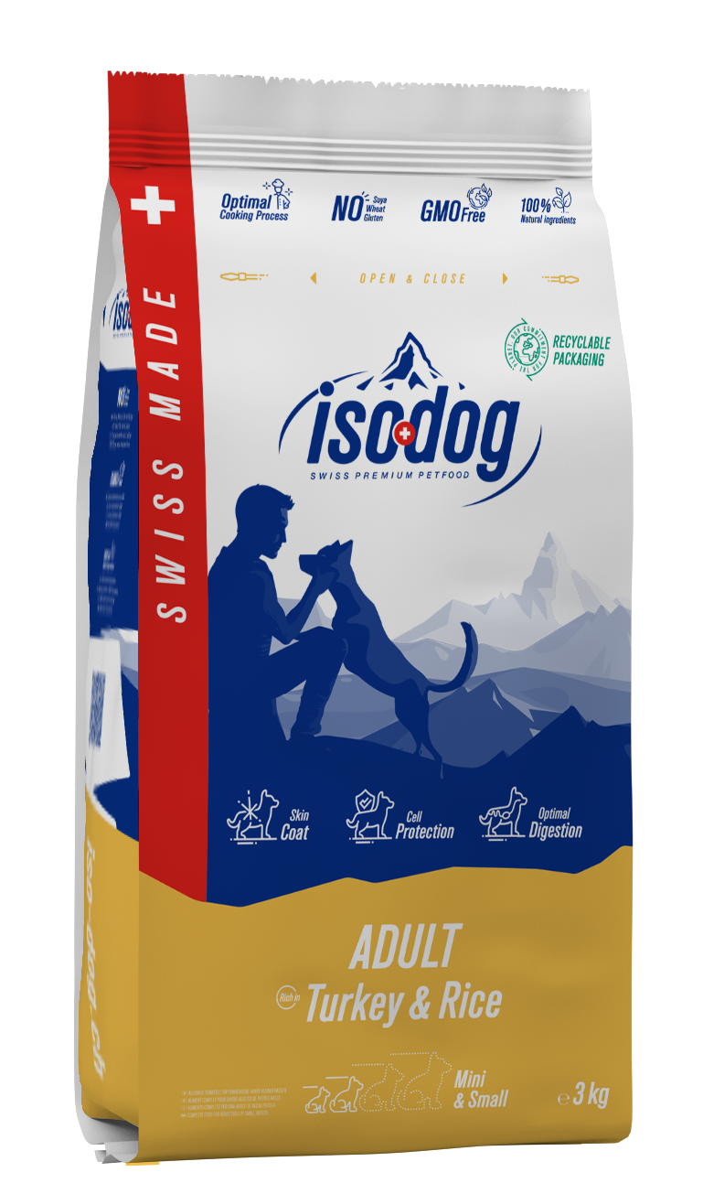 Iso-dog ADULT rich in Turkey & Rice Mini & Small est un aliment complet pour chiens adultes de races naines et de petites races, à partir du 10ème mois et jusqu‘à l’âge d’environ 8 ans.
