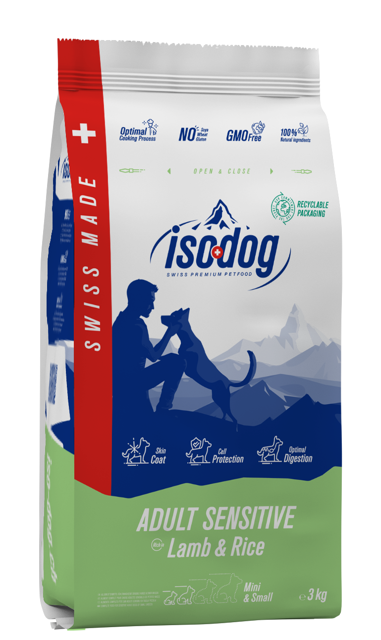 Iso-dog ADULT Sensitive rich in Lamb & Rice Mini & Small est un aliment complet sans gluten pour chiens adultes de races naines et de petites races.